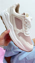Tenis deportivo color blanco talco, malla color nude y suela bicolor.