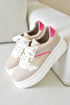 Tenis deportivo con malla beige, tonos talco y fucsia.
